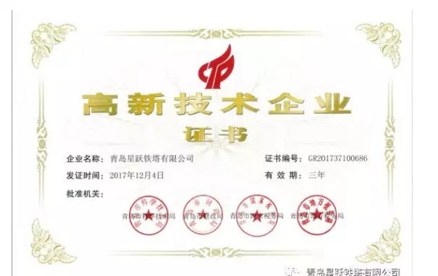 青島星躍鐵塔有限公司于近日收到由青島市科學(xué)技術(shù)局、青島市財政局、青島市國家稅務(wù)局、青島市地方稅務(wù)局聯(lián)合頒發(fā)的《高新技術(shù)企業(yè)證書》